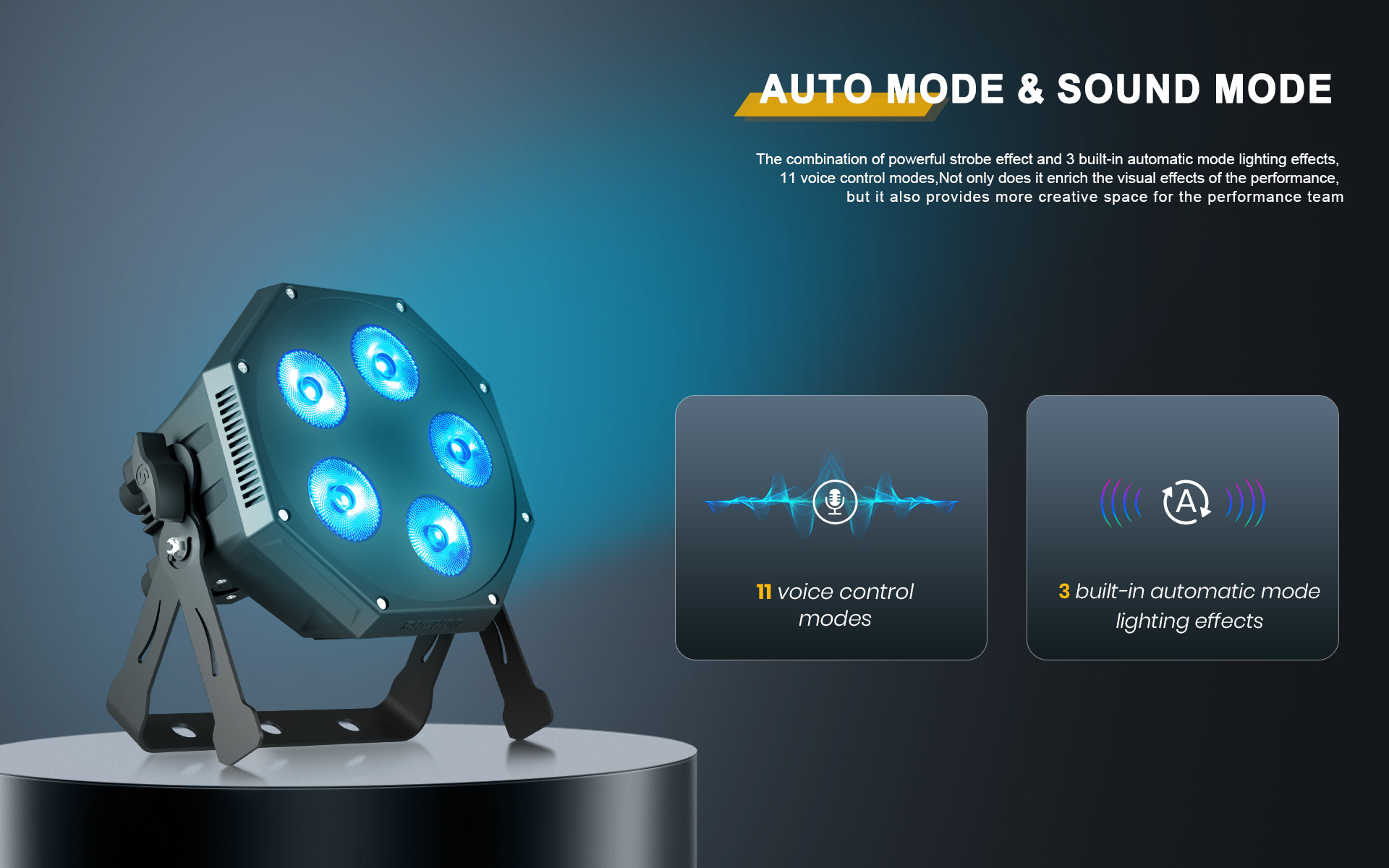 The combination of powerful strobe effect and 3 built-in automatic mode lighting effects, 11 voice control modes,